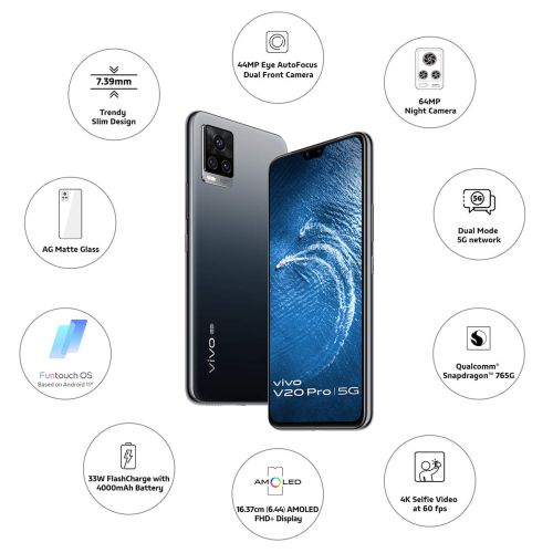 With the stunning and innovative camera technologies of the Vivo V20 Pro, you can become a social media star with clear, detailed, and vivid photos and high-quality videos. The Night Selfie 2.0 with Aura Screen Light technology to click spectacular photos and videos. Also, it is powered by the Qualcomm Snapdragon 765G 5G Mobile Platform for a smooth and easy mobile computing experience.